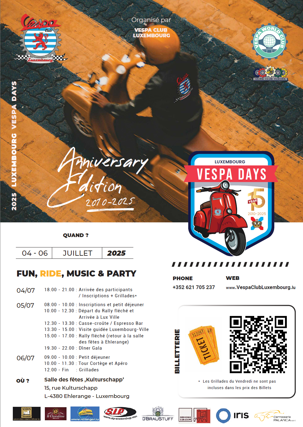 Réservez vos places et vos billets dès aujourd’hui en scannant le code QR sur le flyer des Vespas Days Luxembourg ou en vous rendant directement à la billetterie via le lien suivant : https://www.billetweb.fr/luxembourg-vespa-days