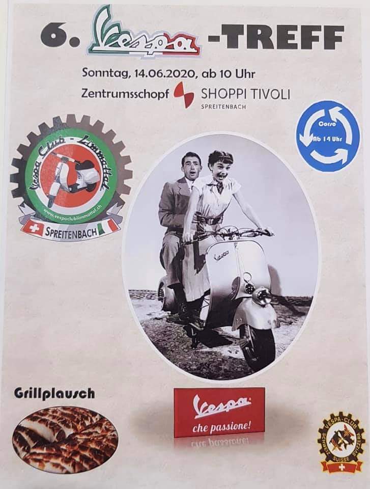 4. März 2020Keine KommentareAbgesagt: 6. Vespatreffen SpreitenbachDani6. Vespa Treffen SpreitenbachCorso ab 14 Uhr Im Zentrumschopf SHOPPI TIVOLI 8957 Spreitenbach